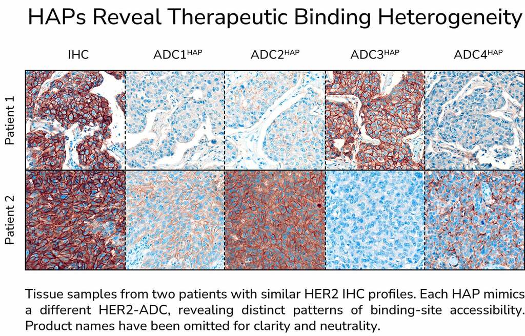 Not all drugs that target the same protein will bind equally — or at all — in patient tissues. Despite being designed for the same molecular target, ADCs can show dramatically different binding profiles depending on their specific epitope, the tumor microenvironment, and structural accessibility. These differences are often invisible to conventional diagnostics like IHC, FISH, or sequencing. By mimicking therapeutic binding with high precision, HAPs provide a level of insight into drug-target engagement in tissue that is not accessible through conventional assays — offering a powerful tool for translational research and patient stratification.